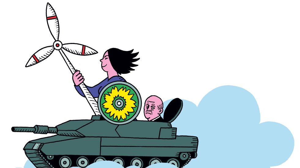 Jedenfalls abgesehen vom Artikel der das Hott, Hüh & Hotte- Hüh deutscher Außenpolitik beschreibt möchte ich besonders die Karikatur der AB auf dem Panzer sitzend, mit wehenden Haaren, bewaffnet mit Windmühle und Antiatomkraftschild hervorheben. Ein dümmlich zuschauender Scholz auf dem „letzten“ Platz rundet das Bild ab. Einfach Klasse ! !