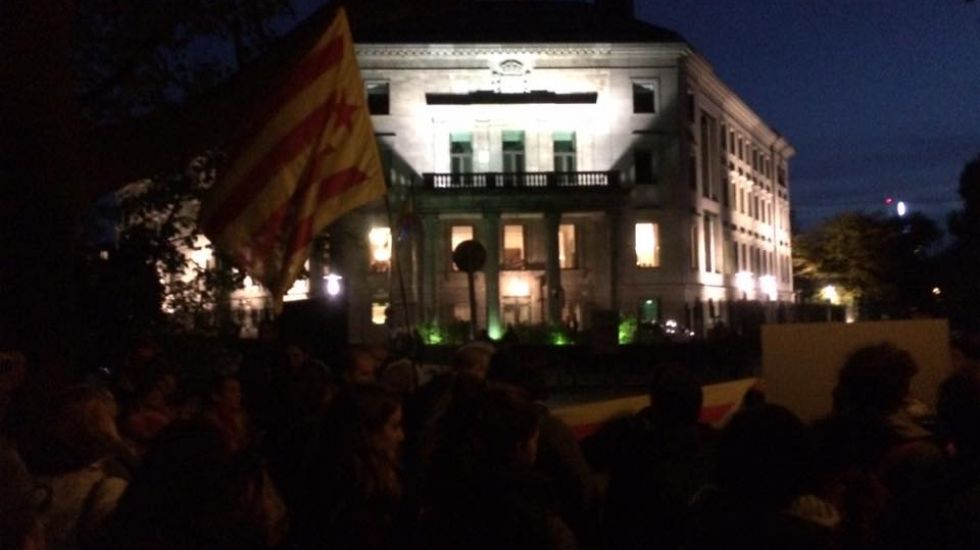 Zum spanischen Nationalfeiertag versammelten sich 50 Demonstranten vor der Botschaft in Berlin, um gegen das Verhalten der Regierung im Katalonien-Konflikt zu protestieren. Die Kundgebung wurde jedoch vor allem zu einem Protest gegen die spanische Erinnerungspolitik