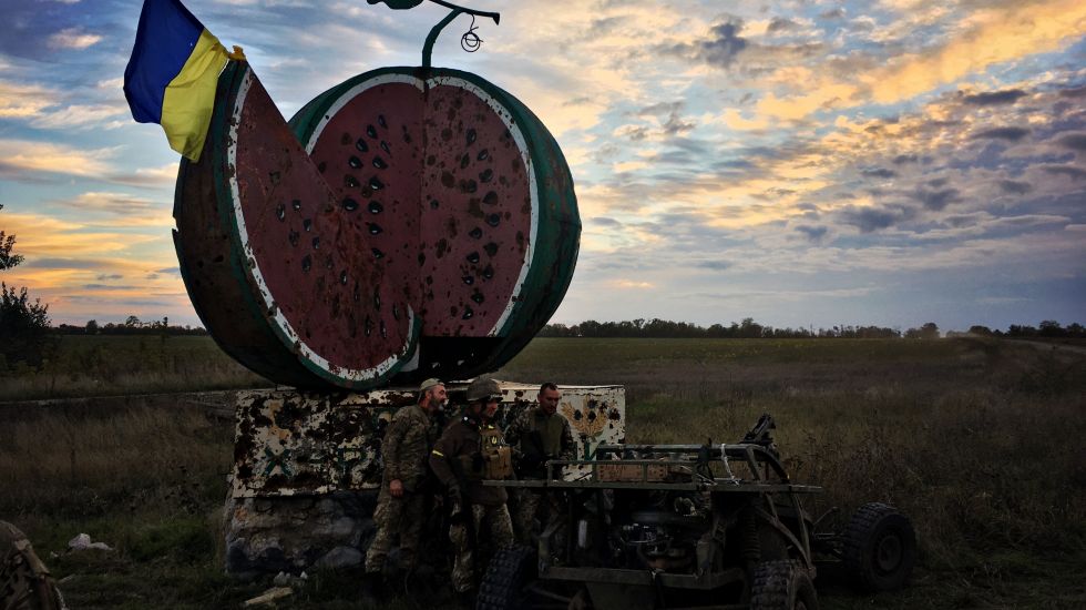 Auf der Straße am Ufer des Flusses Dnjepro, ukrainisch Dnipro, brausen an diesem Tag Panzer, Truppentransporter, Artilleriegeschütze, Autos mit Soldaten in Richtung Front: Anfang Oktober ist der ukrainischen Armee gerade an dieser Stelle ein Durchbruch in das russisch besetzte Gebiet Cherson nördlich des Dnipro gelungen, Hunderte Quadratkilometer wurden in wenigen Tagen befreit. Für das Einsammeln der getöteten russischen Soldaten war keine Zeit; die Überreste mehrerer von ihnen liegen auf der Straße.