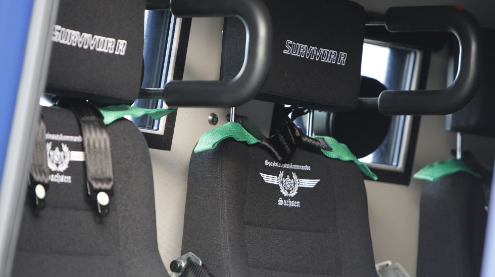 Was keiner bedachte – den Innenraum des Fahrzeuges schmückt ein pikantes Detail. Auf die Sitze wurde in Frakturschrift „Spezialeinsatzkommando Sachsen“ gestickt, darunter stilisierte Adlerschwingen sowie ein Wappen mit Krone, Löwen und Lorbeerkranz. Das Logo erinnerte zunächst vor allem einige Nutzer in den sozialen Netzwerken an NS-Symbolik.