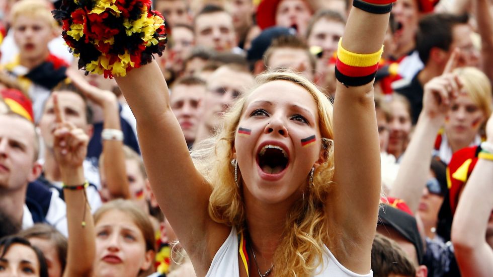 Deutsche Fußballfans jubeln zusammen am 30.06.2006 auf der Fanmeile am Brandenburger Tor während der Fußball-WM 2006 in Berlin.