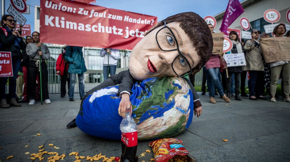 Eine Aktivistin von Campact liegt mit einer Großmaske, die die CDU-Vorsitzende Annegret Kramp-Karrenbauer darstellen soll, bei einer Kundgebung, die mangelnden Klimaschutz der Union bemängelt. Das Klimakabinett trifft sich gleichzeitig im Kanzleramt.