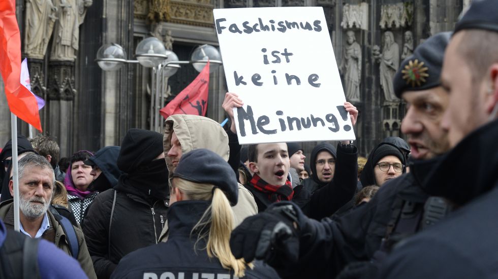 , der das Schild in die Höhe hält, sollte mir einmal erklären, was für ihn einmal "Faschismus" ist.