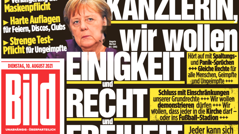 Nein, ich hatte mich nicht versehen. Wir, stand da schwarz auf weiß, forderten gleiche Rechte für Geimpfte und Ungeimpfte. Wir wollen demonstrieren dürfen. Und Wir brauchen die Vorschriften der Kanzlerin nicht. Wenn man das Ohr dicht an die Zeitung hielt, konnte man hören, wie der Chor der von Dir zitierten Corona-Skeptiker – featuring Nena, Til Schweiger und Hubertus Knabe – die Deutschland-Hymne sang. Halleluja!