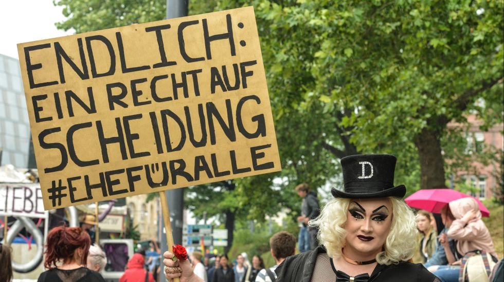Eine transsexuelle Frau hält ein Schild mit der Aufschrift "Endlich: Ein Recht auf Scheidung #Ehefüralle".