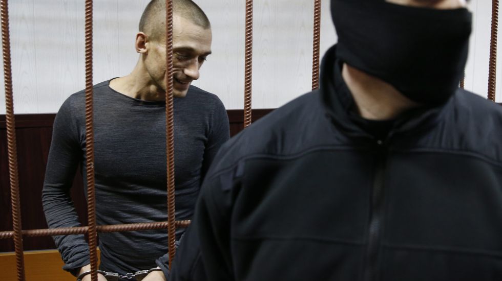 Und nun Pawlenskij. Der Petersburger Künstler war im Fahrwasser von Pussy Riot zu Ruhm gelangt: Er hatte sich aus Protest gegen die Repressionen des Kremls den Hodensack auf den Roten Platz genagelt, den Mund zugenäht, sich nackt in Stacheldraht gewickelt und war dafür mit freundlichen Porträts bedacht worden. Er sagte darin schöne Dinge, die sich mit dem Lied „Die Gedanken sind frei“ zusammenfassen lassen.