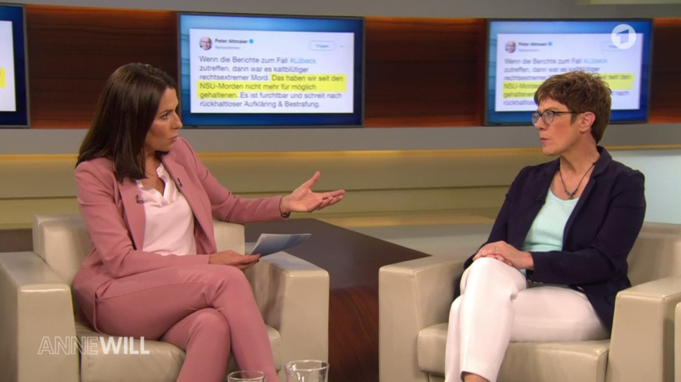 Sie gehe davon aus, dass der jetzige Verfassungsschutzpräsident, Thomas Haldenwang, „das auch mit einer anderen Intensität weiter treiben wird, als das augenscheinlich vorher der Fall war.“ Nachgehakt von Anne Will, wurde die CDU-Vorsitzende dann noch deutlicher: Sie könne bei Hans-Georg Maaßen „vor allem überhaupt nicht nachvollziehen“, dass dieser jetzt in einem Interview mit dem Deutschlandfunk dazu „aufgerufen hat, man könne sich möglicherweise auch Annäherungen an die AfD vorstellen“. Denn zumindest Teile dieser Partei oder ihrer Repräsentanten zögen keine klare Linie zu Rechtsextremisten und Rechtsradikalen. Und diese würden zum Teil das „geistige Klima“ desjenigen schaffen, der da augenscheinlich auf der Terrasse die Waffe in die Hand genommen, sie Walter Lübcke an die Schläfe gedrückt und dann abgedrückt habe.