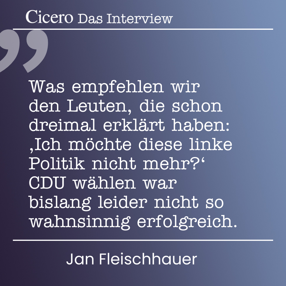 ohne mindestens einmal die AfD negativ ins Spiel gebracht zu haben. Ist wohl ein (un)geschriebenes Gesetz. „...dass AfD-Politiker ebenfalls nicht besonders witzig sind.“ Da muss sich aber jeder fragen, wie besonders witzig ein Merz, eine Merkel, eine Dröge, Haßelmann, Faeser oder eine Strack-Zimmermann sind. Frau Zinner studierte Sozialwissenschaften-ja, das kommt von sowas! Und wow, Merz „performt“ außenpolitisch? Wo genau? Auf Samoa oder anderen wichtigen Regionen der Welt? Ach ja: J.Fleischhauer, nettes Interview, Haltungsverbogene und Meinungsstabile würden seine Sprüche als populistisch brandmarken, aber im Großen und Ganzen scheint er mir doch eher „mittig“ zu ticken, trotz seiner ab und zu durchscheinenden verbal sozialistischen Anwandlungen. Ich denke, seine „follower“ rekrutiert er eher aus dem konservativen Spektrum. Ich kann mit seinen Ansichten gut leben.