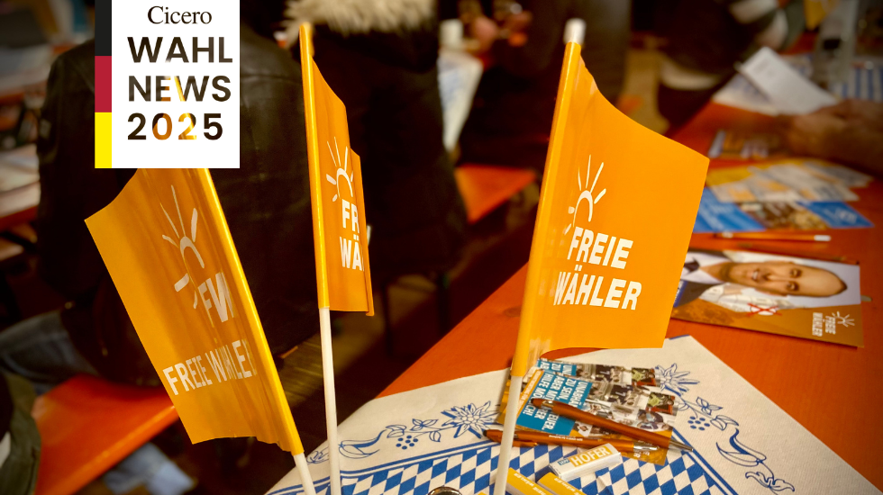 Wenn draußen demonstriert wird und drinnen Blasmusik spielt, dann ist in Bayern Wahlkampf. Am vorletzten Freitag im Januar, es sind noch exakt vier Wochen bis zur Bundestagswahl, haben die Freien Wähler in die Auerbräu-Festhalle im oberbayerischen Rosenheim geladen. Auf der Speisekarte stehen Wildgulasch, Kässpatzn und Currywurst, auf den Tischen die in bayerischen Wahlkämpfen obligatorischen Maßkrüge mit kleinen Fähnchen der Partei.
