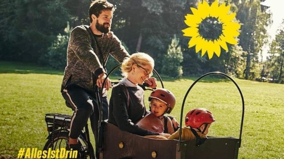Ein Wahlplakat der Grünen zeigt eine Familie beim Ausflug mit einem Lastenfahrrad – und wurde dafür aus allen politischen Lagern kritisiert. Dabei kann man auch etwas positiv hervorheben: Dass die Grünen mit einem Stockfoto für sich werben, ist erstaunlich ehrlich.