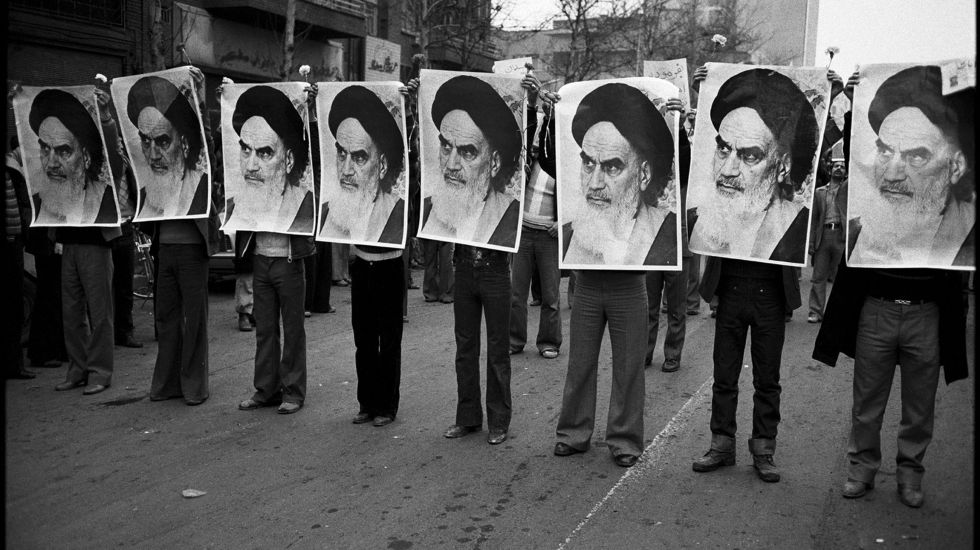 Auf einer Teheraner Straße haben sie sich in Pose gesetzt, die Gesichter verdeckt hinter hochgehaltenen Plakaten mit dem Konterfei von Ajatollah Khomeini. Was wie Concept Art wirkt, ist von erhabenem Ernst. Hier stehen Studenten, bekehrte Anhänger der marxistisch-leninistischen Tudeh-Partei. Die anikonische Kultur des Islam hatte in vormoderner Zeit keine Bildwerke für volkspädagogische Zwecke eingesetzt. Wertvorstellungen und Ideale wurden über Musik und Dichtung vermittelt. Es bleibt bittere Ironie der Geschichte: Islamisten kopieren Bildstrategien, die sich im Personenkult der Stalin-Ära herausgebildet hatten.