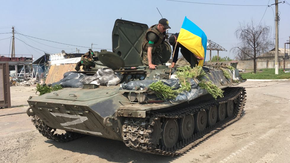 An der Einfahrt bringen zwei ukrainische Soldaten gerade ein russisches Panzerfahrzeug in Fahrt: Der Buchstabe Z ist gut zu sehen, an der Seite haben die russischen Soldaten mit weißen Lettern „Babaljub“ geschrieben, „Frauenliebhaber“. Jetzt weht über dem Panzer eine ukrainische Flagge. „Gerade erobert“, ruft der Panzerfahrer, bevor das Gefährt mit Getöse in Richtung Charkiw davonbraust.
